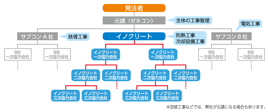 CE事業部における工事現場には、元請(ゼネコン)をトップとした多層構造になっており、